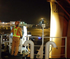 トレーラーシャーシの誘導、固縛は荷役業者が行います。本船の乗組員は、船体設備(船内スロープ...
